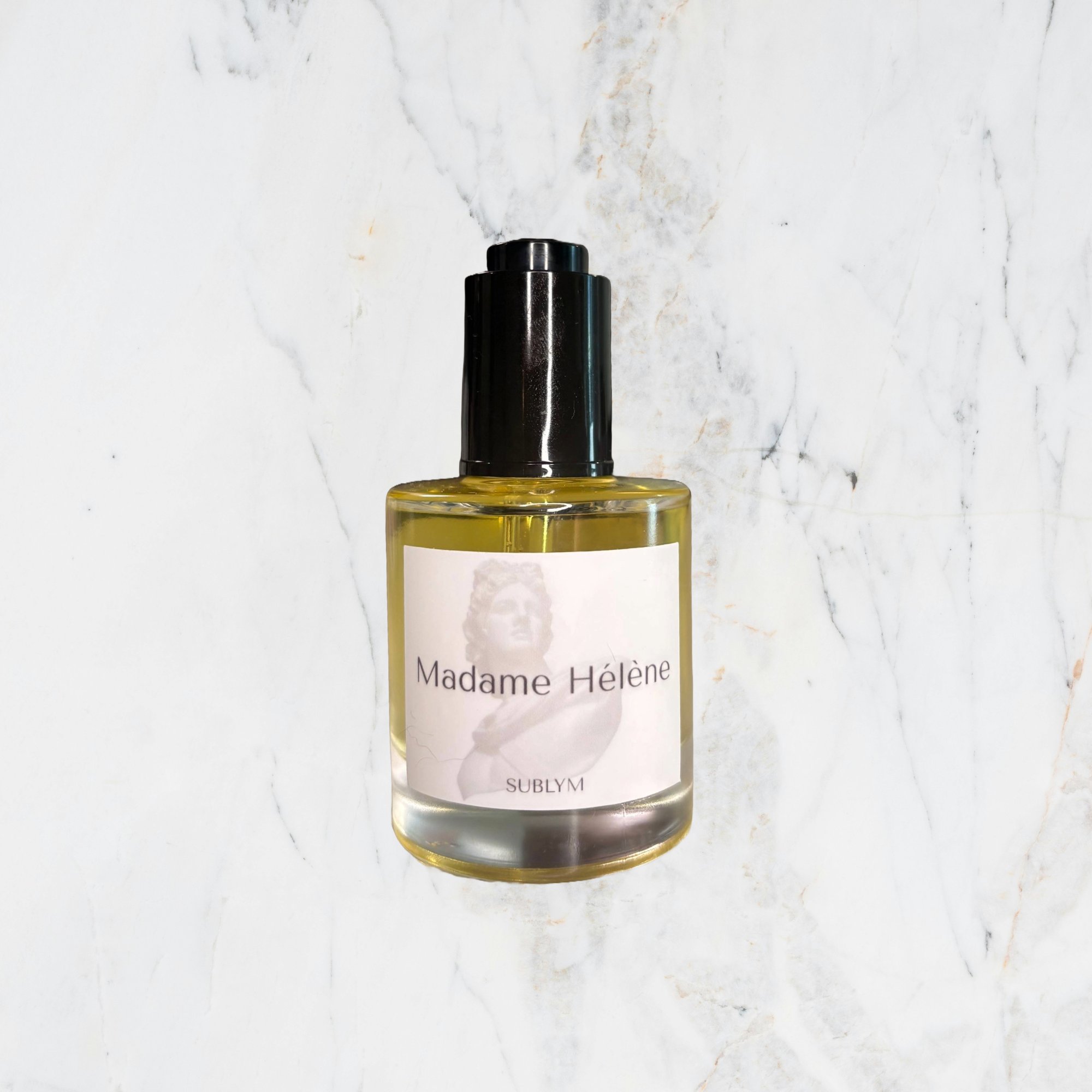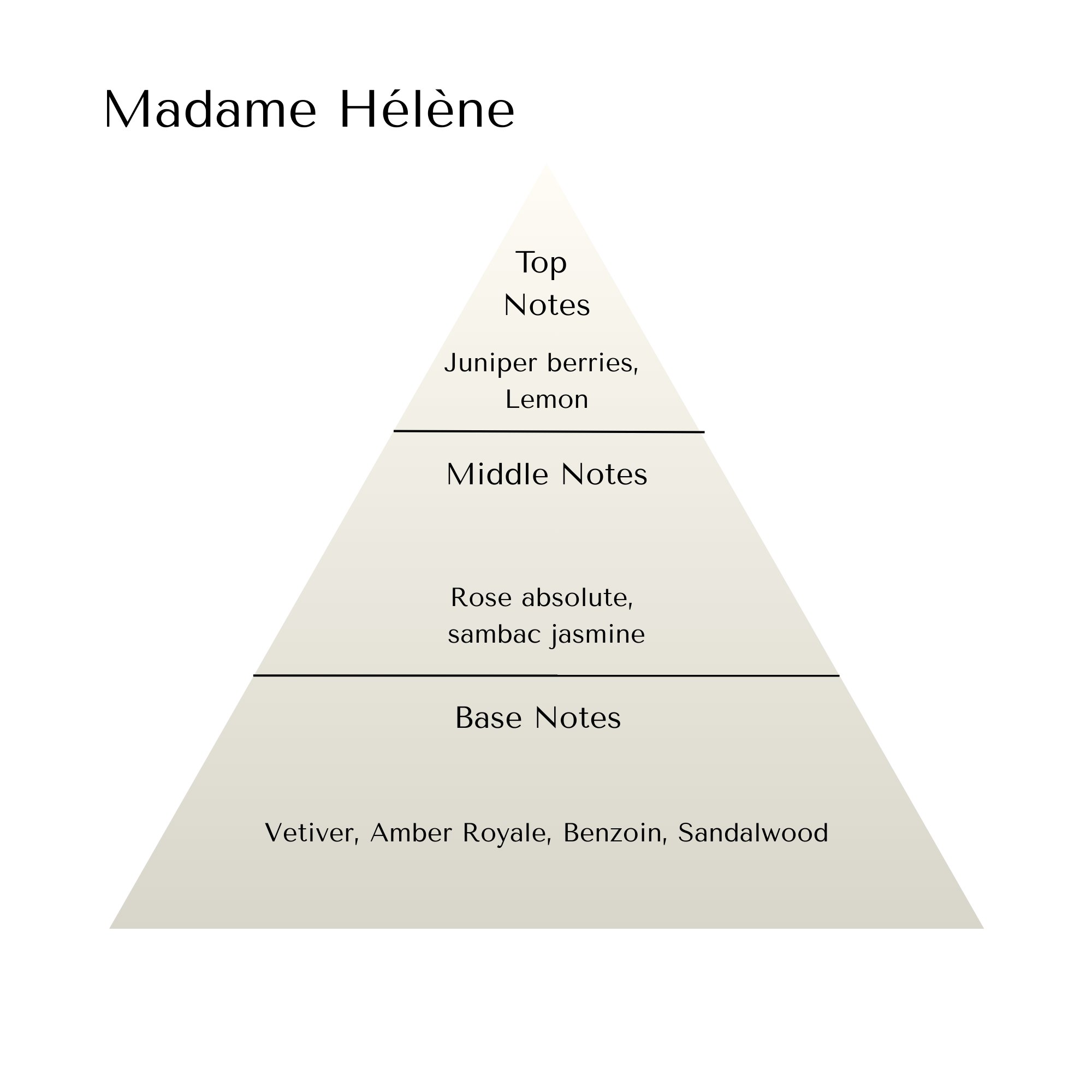 In the final act, the scent settles into its throne. Vetiver lends a dry, grounding elegance, while Amber Royale adds depth and polish. Benzoin brings a resinous warmth, seamlessly layered over smooth sandalwood for a finish that lingers with intention. A modern interpretation of a chypre, Madame Hélène smells like royalty—self-obsessed, timeless, and undeniably in command.